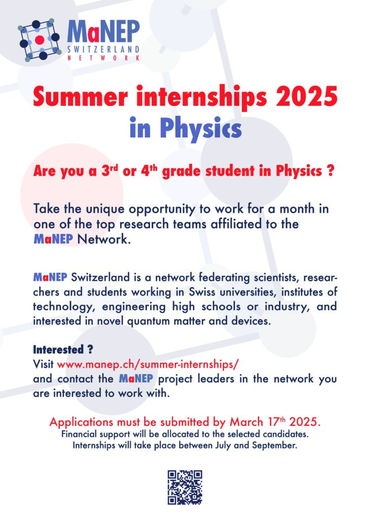 To encourage master students to pursue their career in physics, MaNEP offers them during their 3rd or 4th year of studies in physics, the unique opportunity to spend one month in one of the research groups affiliated to the MaNEP Network, between July and September. Since 2004, these internships have successfully encouraged several of the participants to envisage a more ambitious career in physics.