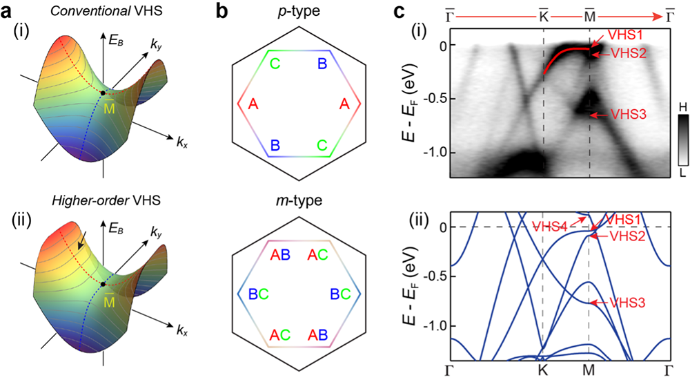 The characteristics of VHS bands are crucial in determining the Fermi surface instabilities. From the perspective of band dispersion around the saddle point, VHSs can be classified into two types: conventional and higher-order, as shown in Figs. 1a (i) and (ii). The higher-order VHS displays a flat dispersion along one direction with less pronounced Fermi surface nesting, generating a power-law divergent density of states (DOS) in two dimensions (2D) instead of a logarithmic divergent one. Moreover, VHSs in kagome lattices possess distinct sublattice features: sublattice pure (p-type) and sublattice mixing (m-type), as shown in Fig. 1b. They induce an effective reduction of the local Coulomb interaction, thereby enhancing the role of non-local Coulomb terms. Therefore, the nature of VHSs is pivotal to understand correlated phenomena, but still remains elusive in the kagome metals AV3Sb5 so far.